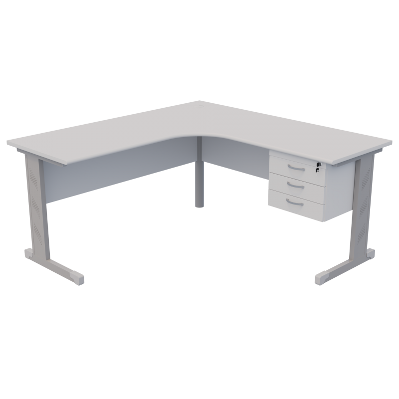 Mesa delta soft, tampo em MDP 25mm c/ Perfil PVC Post Forming 180°, painel frontal em MDP 18mm c/ borda PVC. 03 gavetas com chaveamento múltiplo, trilho telescópico, puxador 96mm zamak cromo acetinado. Estrutura em tubo de aço 30x50 c/ passagem de fiação e calha perfurada removível.