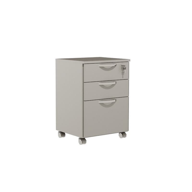 Gaveteiro volante plus 070x048,5x042 (AxLxP), 02 gavetas com chave e corrediça de aço, 01 gaveta para pasta com chave e trilho telescópico, com rodízios, em MDP 18mm com borda PVC. Puxador 128mm PVC cromado fosco. Sistema de montagem com parafuso minifix.