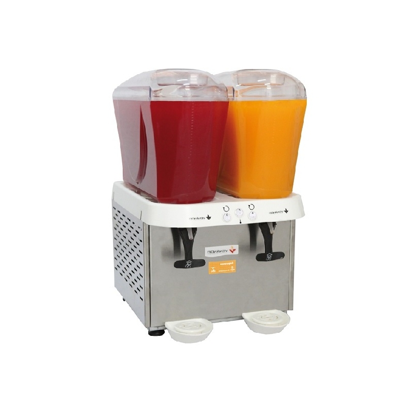 Refresqueira inox 32 litros 068,5x041x049 (AxLxP), com 02 reservatórios, com selo de conformidade expedido pelo Inmetro, gabinete em aço inox escovado, sistema de agitação com pá, teclas independentes para comando de refrigeração e dos agitadores, bivolt.