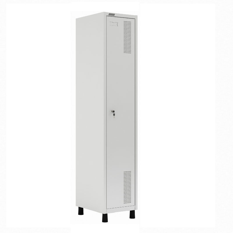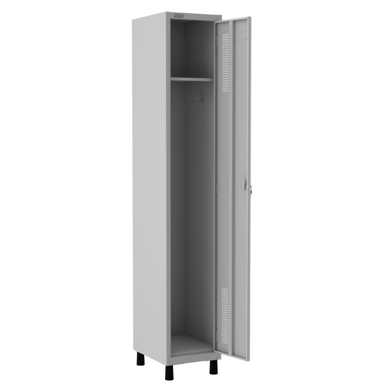 Roupeiro de aço inteiriço 190x032x040 (AxLxP), 01 porta com fechadura, chapa 24 com reforço. Móvel de aço com estampa nas portas, permitindo ventilação. Fechamento com fechadura e chave ou pitão para cadeado. Exclusiva carenagem protetiva, pintura texturizada eletrostática a pó.
