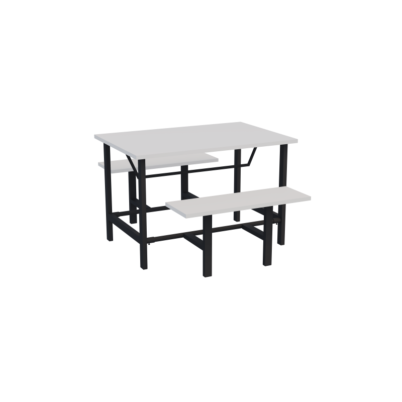 Mesa de refeitório pré 04 lugares com bancos escamoteáveis 055x120x060cm (AxLxP). Estrutura em tubo de aço 30x30 e 20x40 com parede de 1,20mm com pintura eletrostática epóxi-pó. Tampo em MDP 25mm c/ revestimento superior em fórmica e bordas de PVC arredondadas. Mochos em MDF 25mm com revestimento superior com fórmica e bordas PVC.